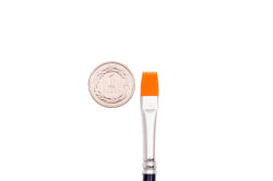 Pędzel wykonany z nylonu, w kolorze żółtym, o równiej długości włosia. Skuwka pędzla wykonana jest z aluminium.