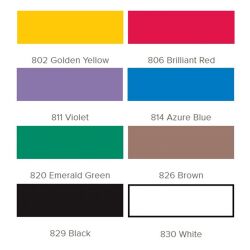 Zawartość zestawu: JACQUARD Dye-Na-Flow Paint 8x 0,5oz / 14,79ml - 8 farb akrylowych do tkanin w kolorach: #802 Golden Yellow #806 Brilliant Red #811 Violet #814 Azure Blue #820 Emerald Green #826 Brown #829 Black #830 White