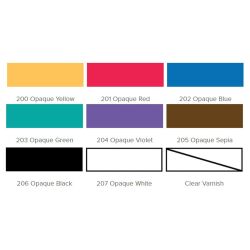 Zawartość: 9x 0,5oz / 14,79ml w następujących kolorach: #200 Opaque Yellow #201 Opaque Red #202 Opaque Blue #203 Opaque Green #204 Opaque Violet #205 Opaque Sepia #206 Opaque Black #207 Opaque White # Clear Varnish (bezbarwny lakier)