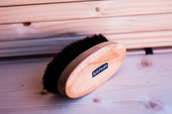 Praktyczna i poręczna szczotka z polerowanego, bukowego drewna. Wysokiej jakości końskie włosie w dwóch kolorach.