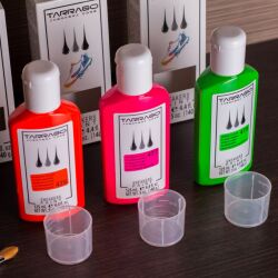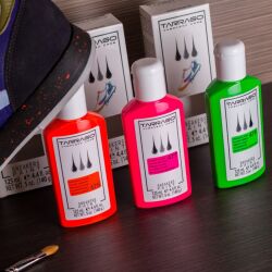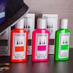 Fluorescencyjne farby akrylowe do customizacji sneakersów, odzieży i akcesoriów. Najczęściej stosowane do naturalnych i syntetycznych skór licowych oraz jeansu i tekstyliów. Właściwe zarówno do malowania detali i precyzyjnych wzorów o ostrych krawędziach, jak i całych elementów. Farba może być aplikowana za pomocą małych i dużych pędzelków i aerografu. Grupa farb najczęściej wykorzystywana przez customizerów do personalizacji butów, jeansowych katan, skórzanych kurtek, plecaków, czapek, t-shirtów i innych akcesoriów. Farby TARRAGO SNEAKERS PAINT równie dobrze spełniają swoją funkcję przy zaawansowanych i prostych renowacjach popularnych kicksów. Wyjątkowa formuła farby o wysokiej koncentracji doskonałych pigmentów przekłada się na siłę i jakość krycia. Jednym z największych atutów produktu jest jakże pożądane wykończenie o stosunkowo niskim stopniu połysku, które można łatwo regulować dedykowanymi finisherami osiągając bardzo naturalny mat, wykończenie satynowe lub dowolny stopień połysku. Większość farb akrylowych daje wykończenie w bardzo wysokim połysku, który trudno zredukować.